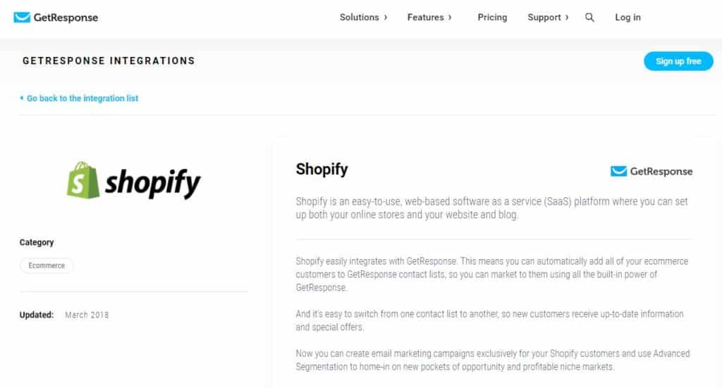 Un potente fornitore di automazione del marketing, Getresponse offre funzionalità come landing page, webinar e un CRM. È tra i migliori strumenti di email marketing di Shopify in circolazione, con la sua integrazione Deep Data che consente la sincronizzazione dei dati di clienti, ordini e prodotti, segmentazione avanzata e tagging.