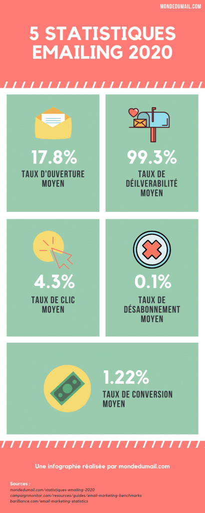 Per facilitare la lettura dei risultati, abbiamo ideato una piccola infografica che riassume le principali statistiche di emailing presentate in questo articolo, vale a dire il tasso di apertura, deliverability, clic, disiscrizione e conversione.